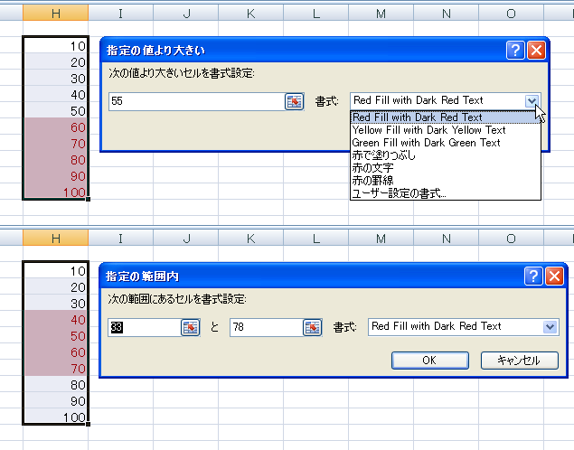 図1の上は、[指定の値より大きい]を実行したところです。表示されるダイアログボックスでは、基準となる「値」と「書式」を設定できます。左のボックスには、選択したセル範囲の平均が自動的に代入されるようですが、テストしてみると単純な平均ではなさそうです。何を計算しているのかわからないのですが、本来ここは平均でいいと思います。製品版で変わるかもしれませんが、現在問い合わせ中です。右のリストからは書式を選択できます。一部英語で表記されていますが、もちろん製品版では日本語になります。[指定の値より小さい]や[指定の値に等しい]も同じようなダイアログボックスが表示されます。図1の下は[指定の範囲内]を実行したところです。