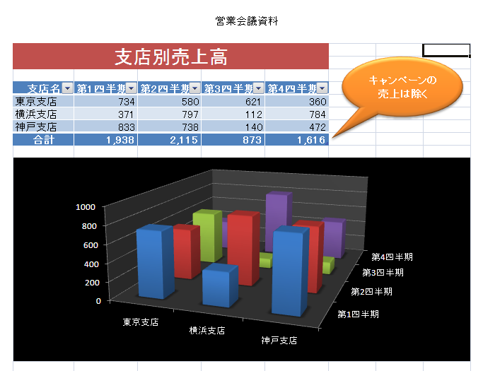 画面はページレイアウト表示です。簡単な表をテーブル機能で装飾し、3Dグラフと吹き出し(オートシェイプ)を追加しました。最上部の「営業会議資料」はヘッダーです。[PDFまたはXPS]を実行すると次のダイアログボックスが表示されます。