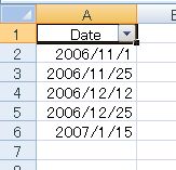 さて、オートフィルタには他にもまだ新機能が隠されています。そのひとつが「今月」や「昨年」などで絞り込む日付フィルタです。オートフィルタを使うユーザーの多くは、日付データを扱う・・・なんてユーザビリティ・テストの結果を反映したのでしょうか。まぁ、確かに日付データを絞り込む場合には便利かもしれません。