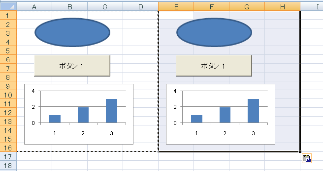 それぞれのオブジェクトが"乗っている"セルをコピーして、別のセルに貼り付けると、セルと一緒にオブジェクトもコピーされます。