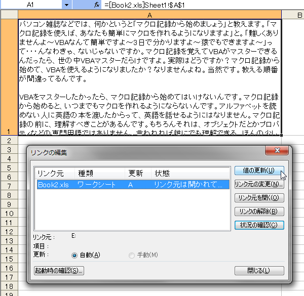 しかし、リンクされている、元のデータが入力されているブックをExcelで開いていないとき、リンクを更新すると255文字までしか取得できませんでした。
