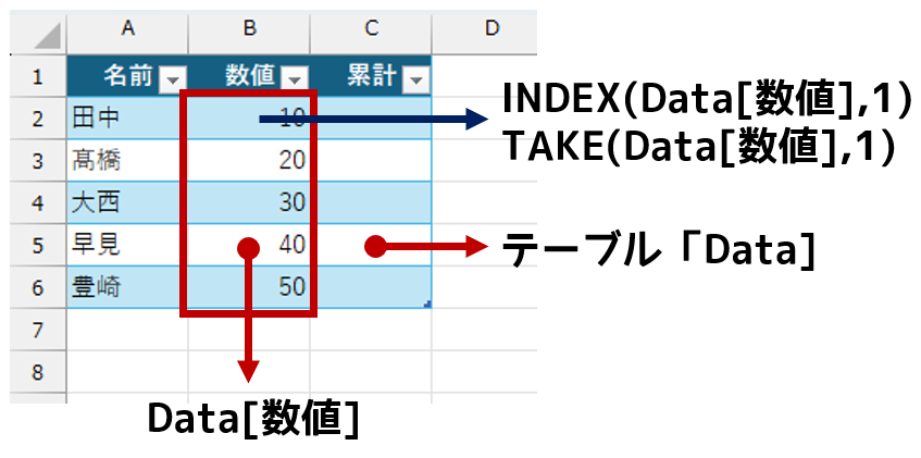 本稿を見直していて、ふと「え?もっと簡単な方法があるのに」って思いました。自分で書いたコンテンツに、自分でツッコミを入れたようなものです。まぁ、よくありますw 本稿では、[数値]列の一番上のセル(今回はセルB2)を「列見出し("数値")のひとつ下」としましたが、そんな回りくどいことをしなくても「[数値]列データの先頭(一番上)」って考えた方が自然です。[数値]列のデータ(アドレスで言えばセル範囲B2:B6)は、構造化参照で「Data[数値]」です。その先頭なのですから、INDEX関数やTAKE関数を使えば一発です。