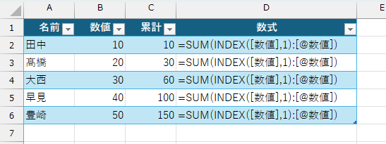 なので、テーブル内で累計を求めるなら、次の数式になります。