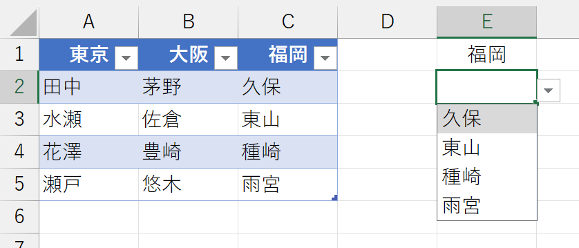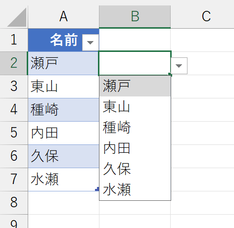 本稿を書いて、しばらくしてから気づきました。TAKE関数を使うと、自動的に重複しないリストが表示されると、上記ではかなりの"驚き"に満ちた内容になっていますが、よく考えてみれば当たり前でしたw 理由は、入力規則のリストが仕様変更されて、自動的に絞り込まれるようになったからです。いわゆる"オートコンプリート"ですね。ちょっと、やってみましょう。