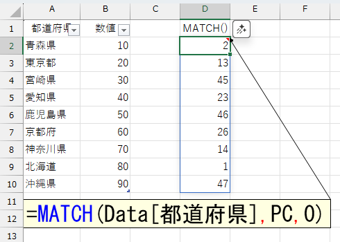 「都道府県コード」順というのは、あくまで一例です。こうした発想で、たとえば「営業所名」順や「製品名」順であったり「役員名」の順番など、いろいろな用途に応用できます。ただ、そうした社内専用の並べ替え基準には、必ずしも数値の"コード"が存在するとは限りません。まぁ、どうせリストを作るのですから、ついでに手で入力してもいいのですが、そもそも数値の"コード"は必須ではありません。要するに調べたい文字列が「上から何番目」に存在しているかを判別できればいいわけで。だったら、MATCH関数で調べちゃえばいいですよね。
