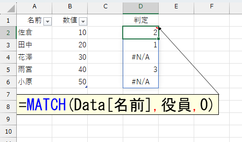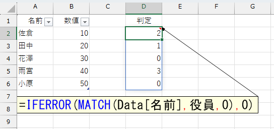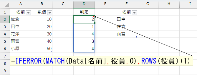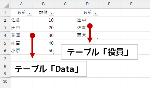 まず、テーブル「Data」の[名前]列を、テーブル「役員」で検索します。