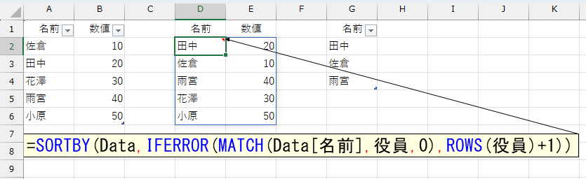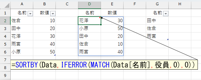 =SORTBY(Data,IFERROR(MATCH(Data[名前],役員,0),ROWS(役員)+1))