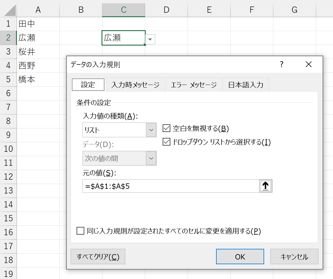 今度は、この名前「名簿」を使って、入力規則の「リスト」を設定してみます。
