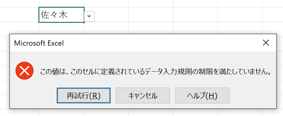 まず、この"入力規則"機能とは「リストを作成する」だけの機能ではなく、本来は「入力される値に規則を定め、規則に反した値は入力させない」仕組みだということです。そして、今回定めたのは「リストに表示される値だけしか入力できない」という規則です。ですから、このセルに"リストに表示されていない値"を入力しようとすると拒否られます。