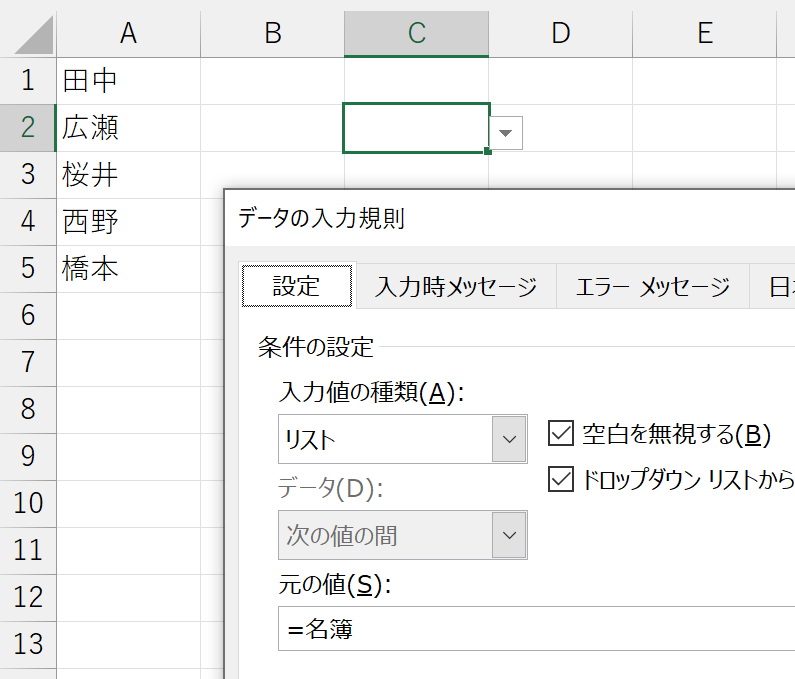 ここまでは、特に問題ありませんね。では、セルC2の入力規則を一度クリアして、今度は次のようにしてみます。まず、リストに表示する項目が入力されているセル範囲に、名前を定義します。ここでは「名簿」としました。