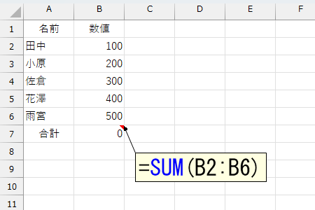 セルB7に入力した「=SUM(B2:B6)」が、正しい結果を返しません。理由と対処法を教えてください。