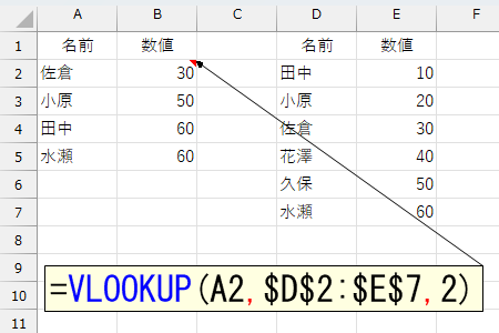 原因: 数式「=VLOOKUP(A2,$D$2:$E$7,2)」には「範囲指定の第4引数(検索方法)」が省略されています。 省略時は「TRUE(近似一致)」となり、完全一致で検索されません。 そのため、A列の名前がD列に正確に存在しない場合や、D列が昇順に並んでいない場合、 誤った値が返されます。 対処法: 第4引数に「FALSE」を追加し、完全一致で検索してください。 修正版(B2セル): =VLOOKUP(A2,$D$2:$E$7,2,FALSE) この数式をB5までコピーしてください。