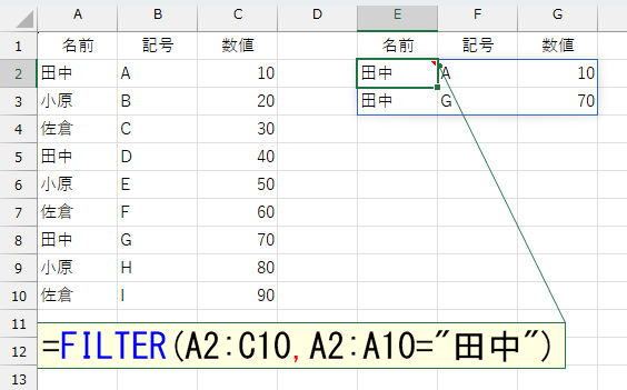 A2:A10の中に「田中」と「田中 」(末尾にスペースあり)が混在しているため、 =FILTER(A2:C10,A2:A10="田中")では完全一致の「田中」しか抽出されません。 A5セルは「田中 」となっており、スペースが原因で一致しません。 対処法: スペースを無視して抽出するには、TRIM関数を使って比較してください。 修正版の数式(E2セル): =FILTER(A2:C10,TRIM(A2:A10)="田中") この数式で、余分なスペースがあっても「田中」と一致するすべての行が抽出されます。