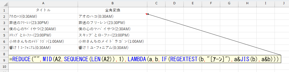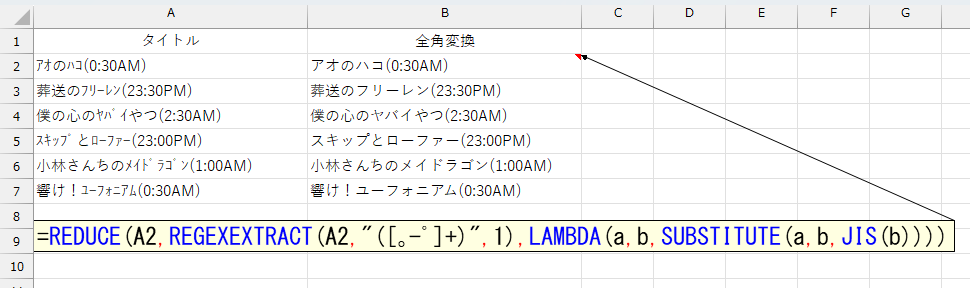 A列に入力されているデータのうち「半角カタカナ」だけを「全角カタカナ」に変換するため、B列に「=REDUCE("",MID(A2,SEQUENCE(LEN(A2)),1),LAMBDA(a,b,IF(REGEXTEST(b,"[ア-ン]"),a&JIS(b),a&b)))」のような数式を入れました。でも結果がおかしいです。うまくいかない理由と、正しく「半角カタカナ」だけを「全角カタカナ」に変換するための対処法を教えてください。