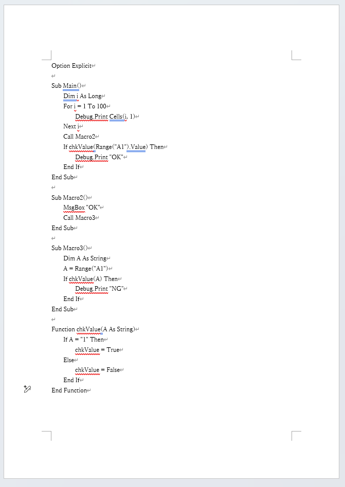 Option Explicit Sub Main() Dim i As Long For i = 1 To 100 Debug.Print Cells(i, 1) Next i Call Macro2 If chkValue(Range("A1").Value) Then Debug.Print "OK" End If End Sub Sub Macro2() MsgBox "OK" Call Macro3 End Sub Sub Macro3() Dim A As String A = Range("A1") If chkValue(A) Then Debug.Print "NG" End If End Sub Function chkValue(A As String) If A = "1" Then chkValue = True Else chkValue = False End If End Function