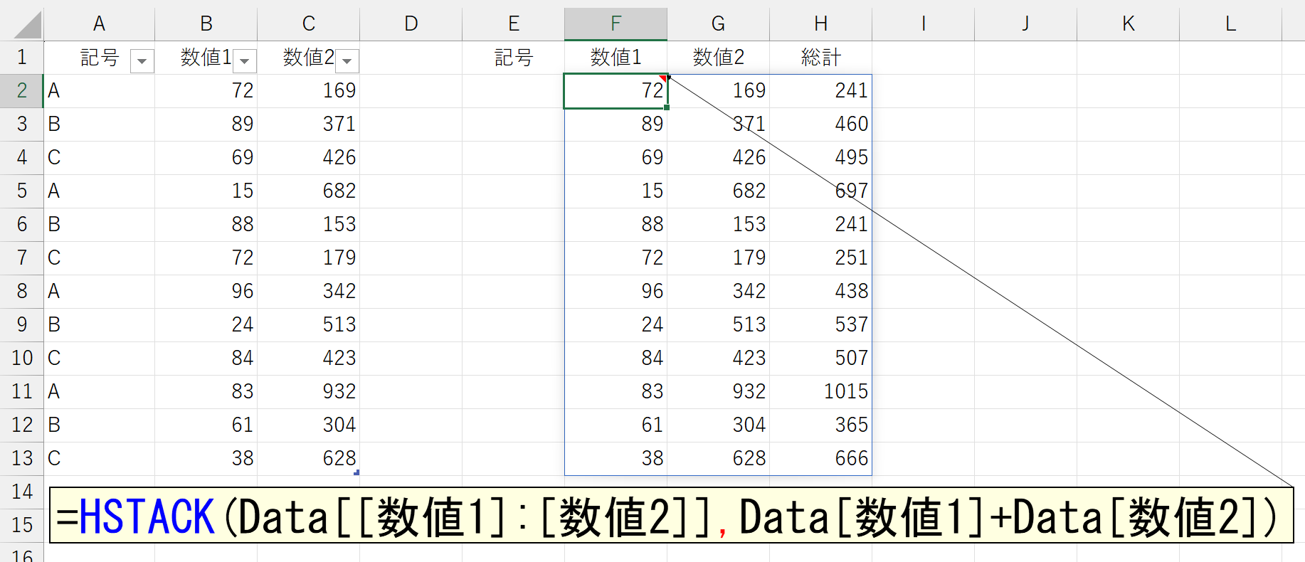 この右側に「数値1」と「数値2」を合計した結果を"配列形式"で結合します。それにはHSTACK関数を使います。