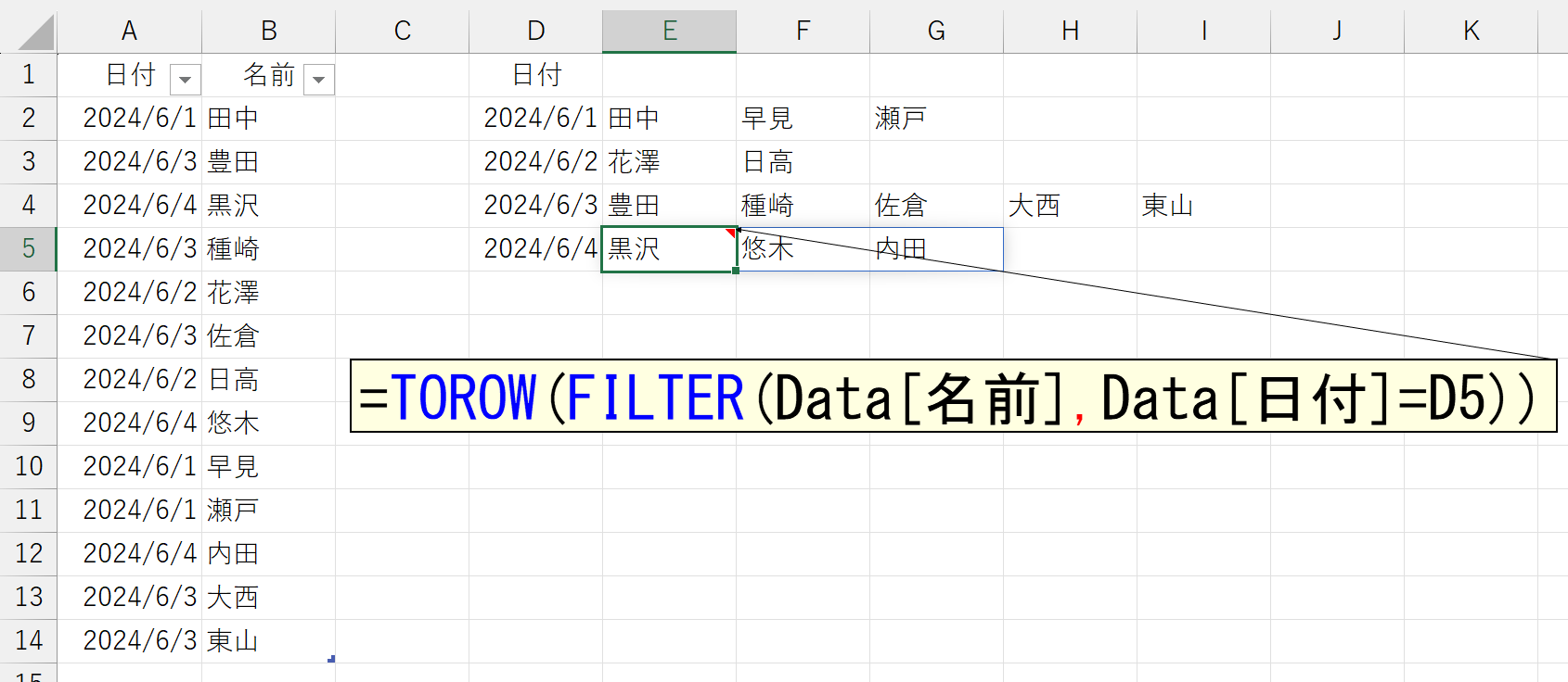 これ、人員のシフトなどを管理している人でしたら、泣いて喜んで庭駆け回る機能なのでは?ちなみに、それぞれの名前を1セルずつ抽出するのでしたら、TEXTSPLIT関数を使うと便利です。ただし、要素の区切りはカンマ(,)だけでなく、半角のスペースも含まれますので注意してください。