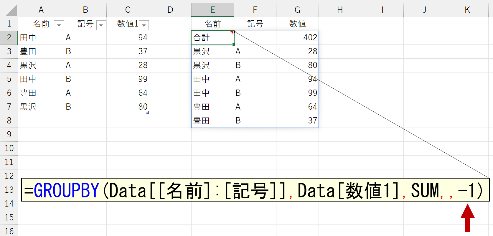 GROUPBY(row_fields,values,function,field_headers,total_depth,sort_order,filter_array,field_relationship) 日本語で表すと GROUPBY(行データ,値,計算方法,ヘッダ,総計,並べ替え,フィルタ,リレーション) かな?