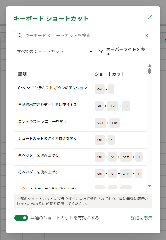 本稿では、Web版Excelのショートカットキーを一覧表にまとめました。ただし、注意点が2つあります。Web版Excelのキー操作一覧はヘルプがありません。ネットで調べたり、AIに聞いたり、あるいはWeb版Excelからのナビゲートでは「こちらをご覧ください」的に案内されますが、本稿執筆時点(2025年10月)には存在しません。あるのは、昔々「Excel On Line」と呼ばれていた時代の超古い内容です。それなら、Web版Excel内に一覧があるのかと言えば、あるのは