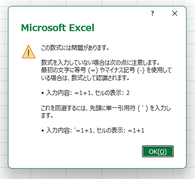 1.は分かりやすいですね。「#DIV/0」や「#スピル!」みたいなやつです。2.は引数に指定したセル範囲などが間違っていて、変な結果を返しちゃうやつ。3.のケースも多くのユーザーが経験しているはず。セルに数式を入力しようとしたら、下図のようなメッセージが表示されて、そもそも数式と認識してくれないケースです。