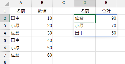 E列には、D列に表示されている名前をA列で調べて、該当する「数値」を合計し、セルE2から下に表示してください。たとえば