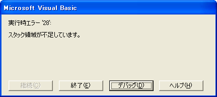 しかし、その記憶場所であるスタック領域には限度があります。「AがBを呼んで、BがCを呼んで、CがDを呼んで、DがEを・・・あぁ、もう覚えきれません..._| ̄|○」という状態が、このエラーです。上のコードみたく、お互いを無限に呼び合うようなミスをすると、VBAのスタック領域はすぐ一杯になります。