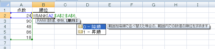 関数によっては、計算の方法を決めるための引数を指定するものもあります。今回のRANK関数では、第3引数に"順位を昇順で求めるか、それとも降順で求めるか"を指定するために「0」または「1」を指定します。ところが、ほとんどの人は「あれ?どっちがどっちだったかな?」と悩みます。Excel 2007の数式オートコンプリートでは、こうした「列挙定数」もリストから選択できます。うれしいことに、何を指定するとどうなるのかといった解説付きです。