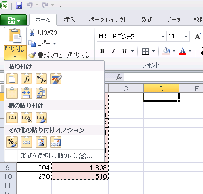 セル範囲B1:B10をコピーして、リボンの[貼り付け]ボタンをクリックすると、次のようなメニューが開きます。