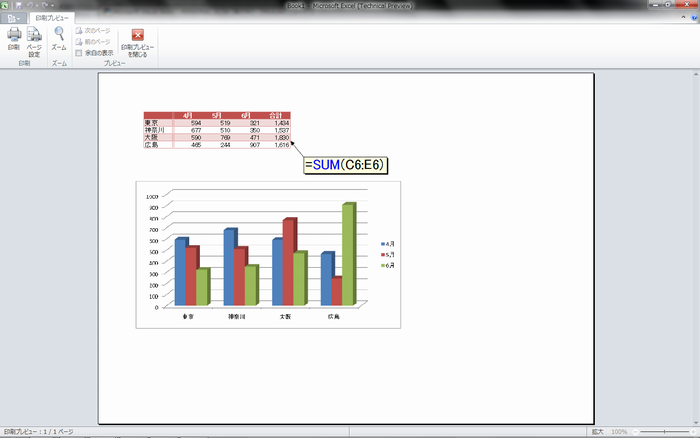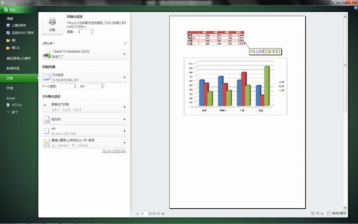 Excel 2010は印刷プレビューが変わりました。従来のように、印刷プレビュー専用の画面が開くのではなく、[Office]ボタンをクリックして開き[印刷]をクリックします。すると自動的に、アクティブシートがプレビューされます。
