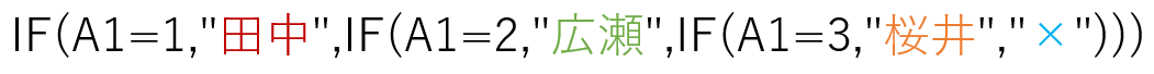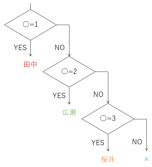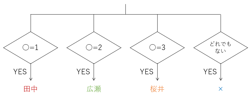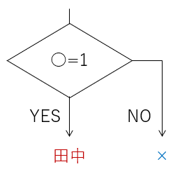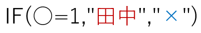 ○が1だったら、"田中"を表示します。そうでなかったら"×"を表示します。"田中"が表示されるのは、○が1のときだけです。"×"が表示されるのは、○が1ではないときです。2だろうが1024だろうが、"Excel"だろうが空欄だろうが何でも、とにかく1でなければ、すべて"×"です。これが IF関数 の動きです。このように「■なのか、そうでないのか」という値を「二値(にち)」と呼びます。最もよく使われる二値は"TRUE"と"FALSE"でしょう。"TRUE"とは「"FALSE"ではない値」と定義されています。今までのExcelには、このような「二値」を判定する IF関数 しかありませんでした。しかし実務は二値だけでは済みません。「1だったら」「そうでなかったら」だけではなく、「1だったら」「2だったら」「3だったら」…という分岐も必要です。そこで、しかたなく今までは