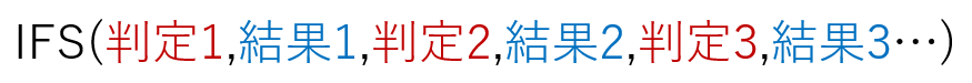 よく似た働きをする両者ですが、動作や書き方などに少し違いがあります。まずは、IFS関数 からいきましょう。IFS関数 の"判定"には、それが正しいかどうかの判定式を指定します。たとえば