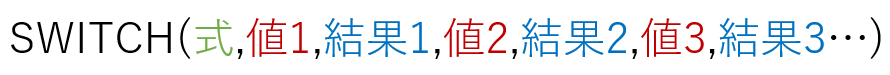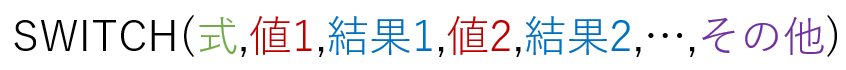 SWITCH関数 の「どれでもなかったら」は、IFS関数 と違い、ただ「値」を書くだけです。SWITCH関数 は「値」と「結果」で1セットです。このセットの一番最後で「値」を書かずに「結果」だけを記述すると、それが「どれでもなかったら」に該当します。