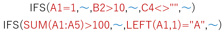 などのように。IFS関数 に指定する複数の"判定"は、それぞれ自由に書けますので、次のように複数の異なるセルを判定したり、複数の異なる式を判定することも可能です。