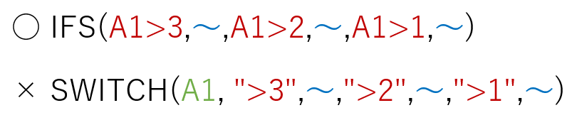 IFS関数 と SWITCH関数 の大きな違いは、これです。判定の対象が異なる式(モノ)だったら、IFS関数 を使います。