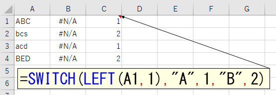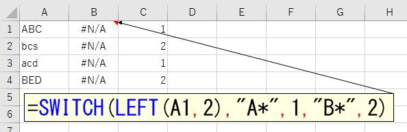 ちなみに、SWITCH関数 はワイルドカードを使えません。また、アルファベットの大文字と小文字は区別されません。