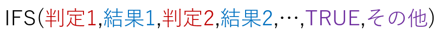 IFS関数 は、「判定」と「結果」を1セットずつ指定します。左から順に調べていき、正しい(TRUEになる)「判定」の「結果」が返ります。もし、どの「判定」もTRUEにならなかったら、IFS関数はエラーになります。どの「判定」も正しくなかったときに「どれでもなかったら」の「結果」を返すには、最後に必ず正しい(TRUEになる)「判定」を指定します。それには「判定」のところに TRUE と記述します。