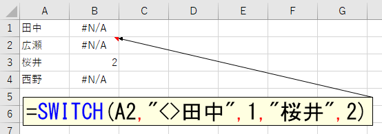 セルA2は"広瀬"です。これは"田中"ではありません。しかし結果は1になりません。つまり「ではない」の判定はできないということです。