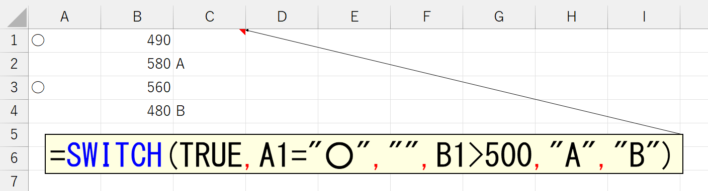 セルA1とセルB1のように、異なるモノを判定していますし、さらに「500より大きい」と大小比較もできます。いやぁ~、SWITCH関数を知ったとき、この使い方に気づかなかった自分が情けないです。恥ずかしいので、本当はこの追記も書きたくなかったです。まぁ、こんなこともありますw。