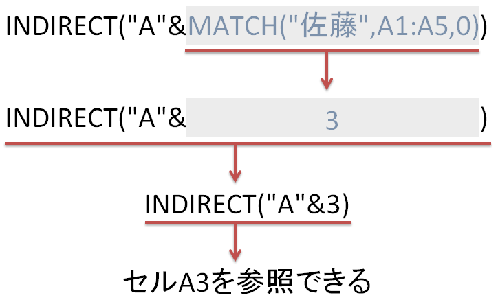 「MATCH("佐藤",A1:A5,0)」は、セル範囲A1:A5内で"佐藤"を探して、上からいくつ目にあるかという、その位置を返します。よろしいですか?「MATCH("佐藤",A1:A5,0)」は数値の3を返すんです。だったら、次のようにしたらどうでしょう。