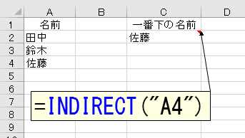 もうひとつ、INDIRECT関数の例をご紹介しましょうか。A列に入力されている名前のうち、一番下の名前を参照してみましょう。