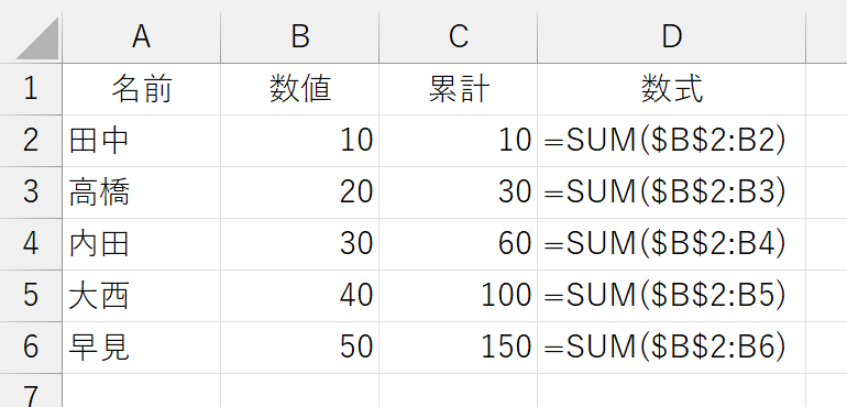 累計というのは、結局のところ"合計"ですから、SUM関数で計算できます。ただし、データは下に増えていくのが普通です。データが増えてC列の数式を下にコピーしたとき、正しく計算されるためには、SUM関数に指定する範囲に工夫が必要です。