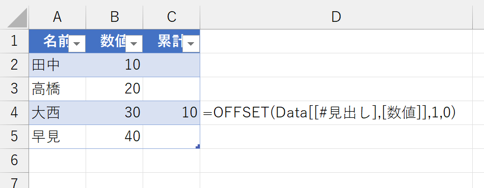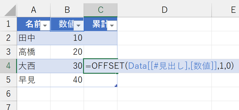なので、テーブル内で累計を求めるなら、次の数式になります。