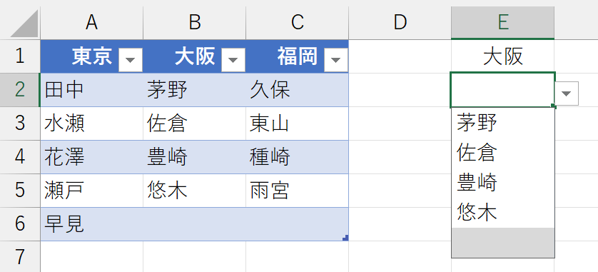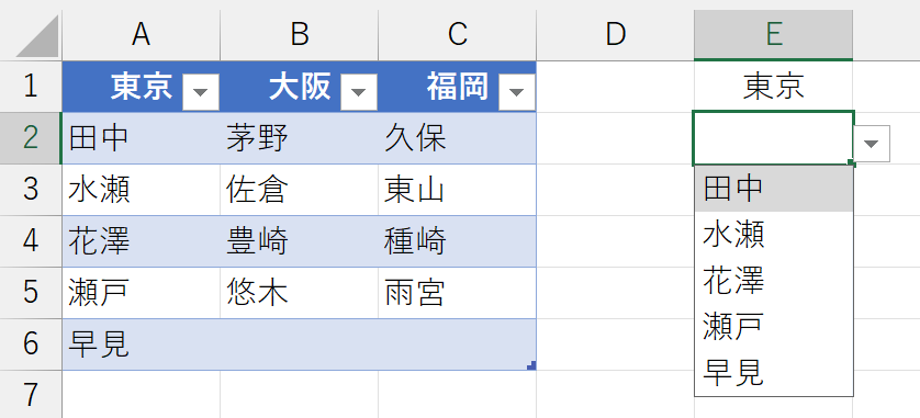 本稿を書いて、しばらくしてから気づきました。TAKE関数を使うと、自動的に重複しないリストが表示されると、上記ではかなりの"驚き"に満ちた内容になっていますが、よく考えてみれば当たり前でしたw 理由は、入力規則のリストが仕様変更されて、自動的に絞り込まれるようになったからです。いわゆる"オートコンプリート"ですね。ちょっと、やってみましょう。