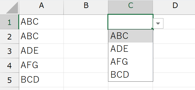 「"AB"で始まる」リストになります。こうしたオートコンプリートでは、重複した値は複数表示されません。複数表示されたら、オートコンプリートの意味がないですし、そもそも最初から「重複しない値は表示しない」という方が使いやすいです。ちなみに、オートコンプリートされない古いExcelでは、下図のようになります。