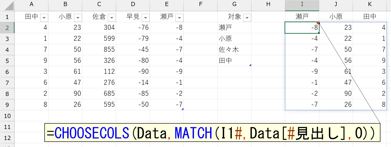 うむ、成功ですね。これを、CHOOSECOLS関数と合体させます。