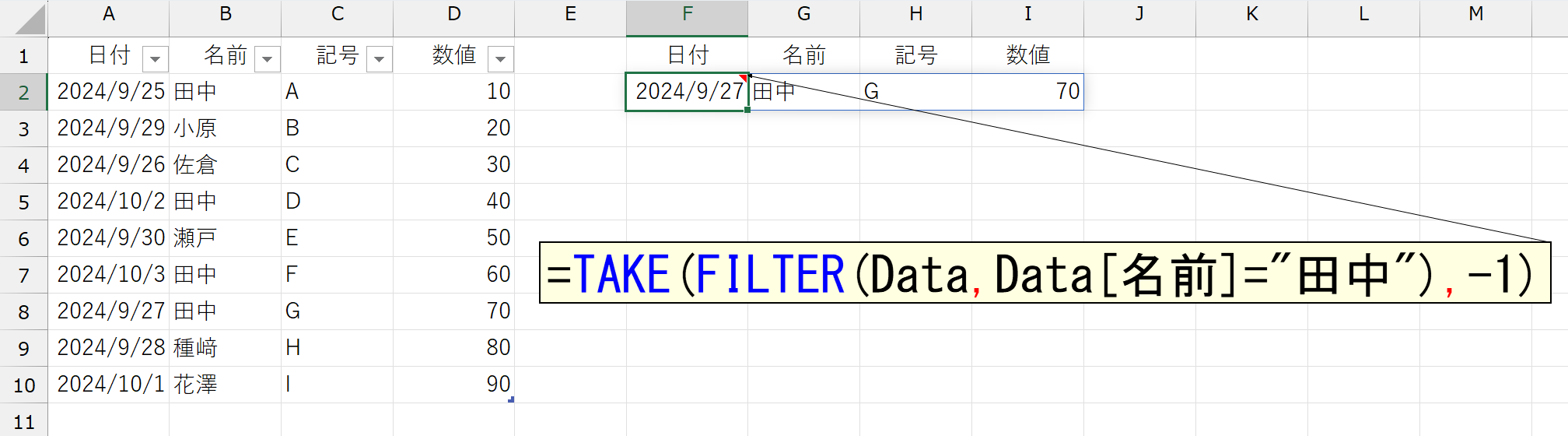 構造化参照でテーブル全体を指定できるのですから、後は自由自在です。一番下のデータ(行)を参照するなら、TAKE関数で一発ですね。TAKE関数については、下記のページをご覧ください。