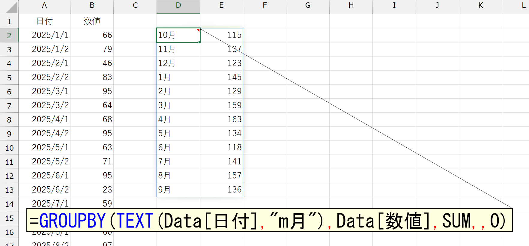 なお、自分で書いておきながらナニですが、上図の数式は「う~ん、ちょっと正確性に欠けるかなぁ~」って感じています。より正確に処理するのなら、GROUPBY関数の結果から左1列を抽出し、そこから並べ替え基準となる数値などを生成し、その基準で並べ替えた方がいいんだろうなと。そうは思いましたけど、数式全体がメッチャ長くなるので、今回はこのままいきます。「1月・2月・3月…」から「1・2・3…」生成するのでしたら、上図の数式で問題ないかなって。今回のケース限定ってことでお願いします。