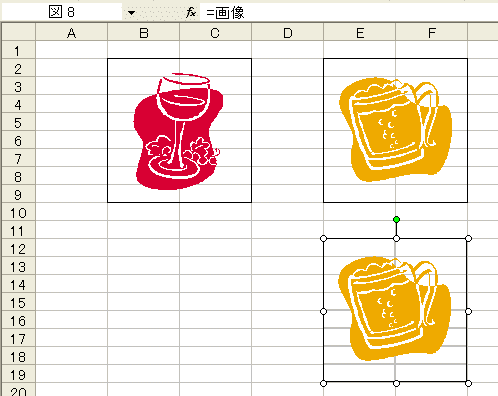 ダイアログボックスを閉じると、貼り付けた画像が選択された状態になっているはずです。選択されていないときは画像をクリックして選択してください。数式バーに「=$E$2:$F$9」と表示されているのを確認してください。