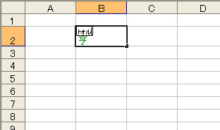 下図は[書式]-[ふりがな]-[表示/非表示]でふりがなを表示している状態です。セルB2の「田中」は他のソフトから貼り付けたのでふりがなが設定されていません。