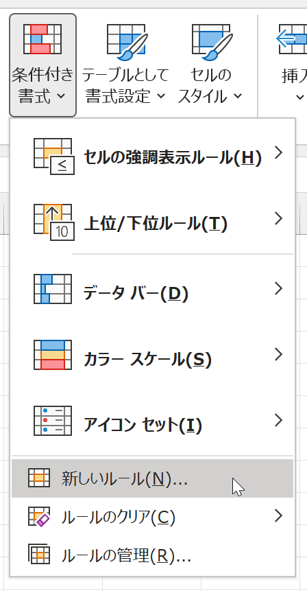 この状態で、[ホーム]タブ[スタイル]グループの[条件付き書式]ボタンをクリックしてください。続いて、表示されるメニューの[新しいルール]をクリックします。